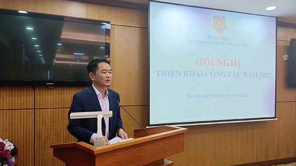 Tại Hội nghị, TS. Vũ Hoài Nam - Quyền Tổng biên tập Tạp chí đã báo cáo khái quát kết quả công tác năm 2021 và phương hướng, nhiệm vụ, giải pháp chủ yếu năm 2022, đồng chí Quyền Tổng biên tập cho biết, trong năm 2021, Tạp chí thực hiện kế hoạch công tác trong điều kiện ảnh hưởng rất lớn của đại dịch Covid-19, các nhiệm vụ đặt ra những yêu cầu mới trong bối cảnh cả nước thực hiện giãn cách xã hội. Thực hiện quy định của Ban Chỉ đạo phòng, chống dịch bệnh Covid-19 của Bộ Tư pháp, các cán bộ, viên chức, người lao động của Tạp chí đã chủ động đổi mới toàn diện trong phương thức hoạt động, đẩy mạnh ứng dụng công nghệ thông tin, đặc biệt là đổi mới cách thức tổ chức nội dung các ấn phẩm, tổ chức xuất bản và phát hành ấn phẩm, công tác cộng tác viên, công tác hỗ trợ và phát triển bạn đọc... để đáp ứng yêu cầu của đa dạng các đối tượng độc giả trong cả nước.