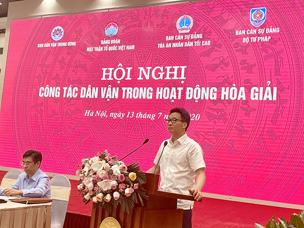 Phát biểu chỉ đạo Hội nghị, Phó Thủ tướng Chính phủ Vũ Đức Đam đánh giá cao kết quả hoạt động hòa giải ở cơ sở đạt được trong thời gian qua, đồng thời đề nghị trong thời gian tới, các cấp, các ngành, các địa phương cần tiếp tục làm tốt công tác dân vận trong hoạt động hòa giải ở cơ sở. Theo đó, cần đẩy mạnh tuyên truyền, phổ biến giáo dục pháp luật, nhân rộng các mô hình hay, cách làm tốt, nhất là có những cải biến mang tính đột phá để đáp ứng tốt nhiệm vụ hòa giải trong thời kỳ mới; các cấp ủy đảng, chính quyền tăng cường tập huấn, nâng cao trình độ, nghiệp vụ cho đội ngũ hòa giải viên.
