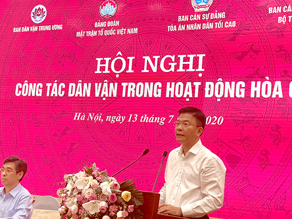Kết luận hội nghị, Bộ trưởng Bộ Tư pháp Lê Thành Long gửi lời cảm ơn đến các đại biểu tham dự Hội nghị và khẳng định, trên cơ sở tiếp thu ý kiến, kiến nghị của các đại biểu, ban tổ chức sẽ tổng hợp, tham mưu với các cơ quan nhà nước có thẩm quyền trong việc hoàn thiện thể chế pháp luật, góp phần nâng cao hơn nữa hiệu quả công tác dân vận trong hoạt động hòa giải cơ sở trong thời gian tới.