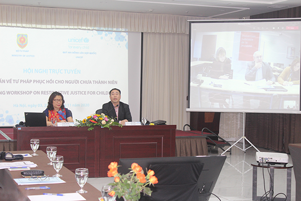 Trong khuôn khổ của Dự án “Tăng cường tiếp cận tư pháp và bảo vệ người chưa thành niên có liên quan đến pháp luật” do Quỹ Nhi đồng Liên Hợp quốc (UNICEF) tài trợ. Chiều ngày 03/11, tại Hà Nội, Bộ Tư pháp phối hợp với UNICEF tổ chức “Hội nghị trực tuyến tập huấn về tư pháp phục hồi cho người chưa thành niên”. Hội nghị diễn ra giữa hai điểm cầu Hà Nội (Việt Nam) và Paris (Pháp) và dự kiến tổ chức trong 03 ngày (03, 23 và 25/11/2020).